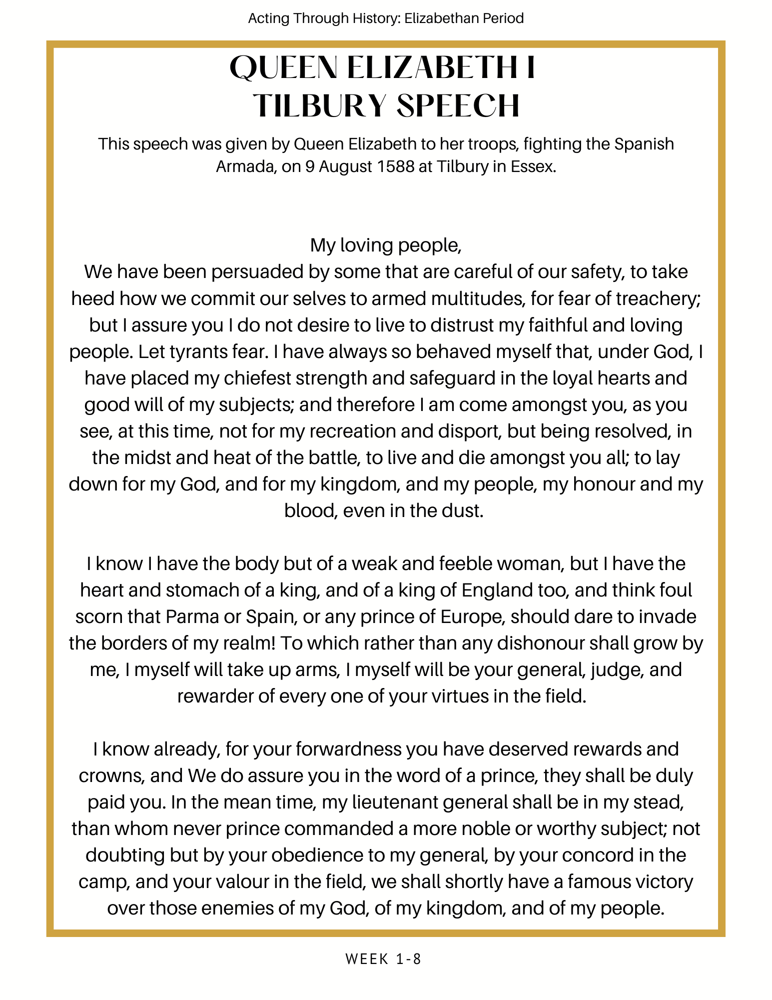 This unit immerses your students into the world of classical history through Queen Elizabeth I's Speech to the Troops at Tilbury. Encourage research skills as students explore the historical context of this famous speech. Weekly activities, written assignments, and practice challenges unleash the potential of subject integration in your classroom, combining language arts, history, and dramatic arts.