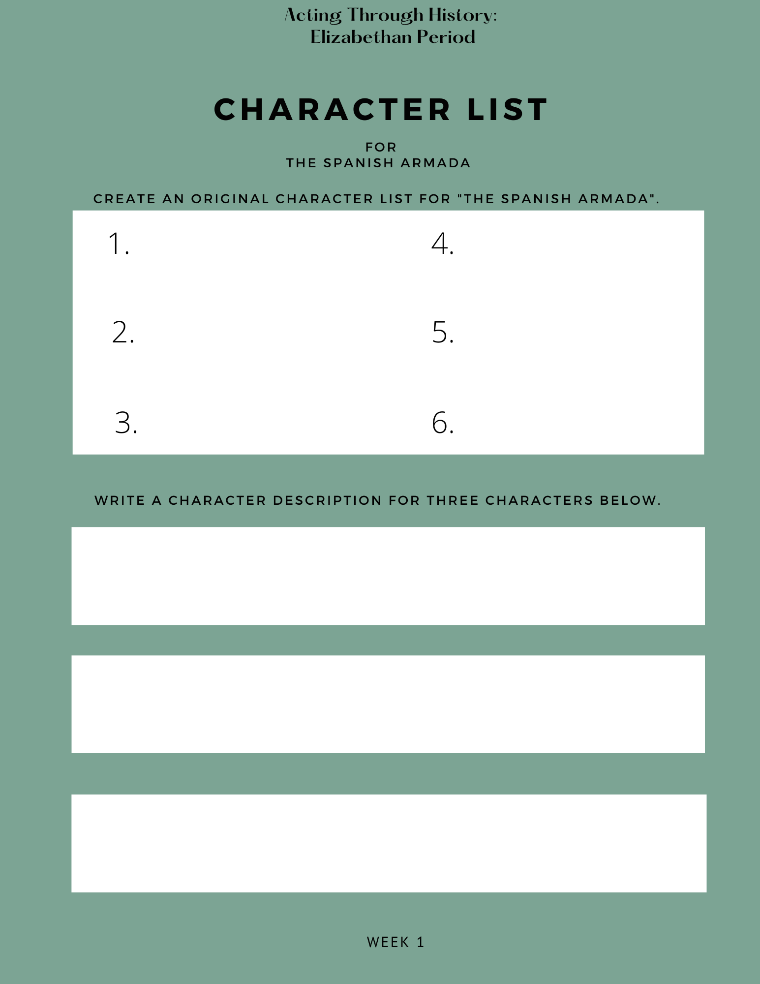 Students approach the lessons as professional actors preparing for a role in a fictional "class" production of The Spanish Armada. They create a character list, choose their roles and take an analytic look at the text. Students use the Queen's speech, research and resources to answer questions about the Elizabethan's way of life, values, and relationships. All the while, they are building a character in preparation for performance.