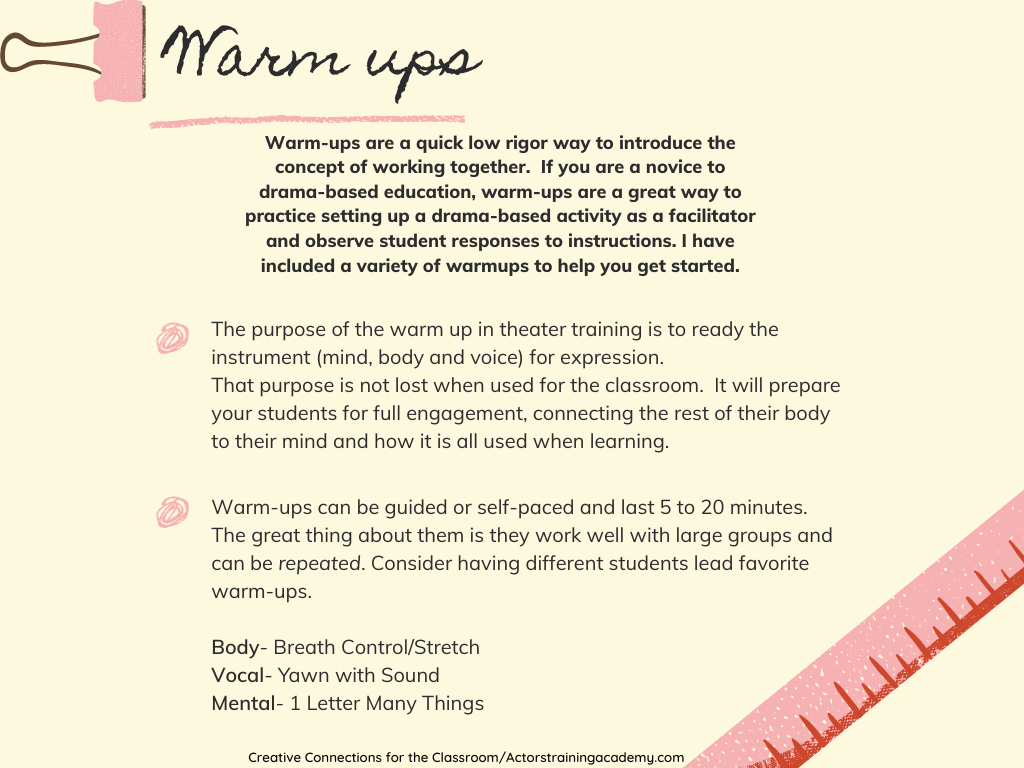 In the lessons that follow you will find printable warmup exercises for the body, face, voice and mind.